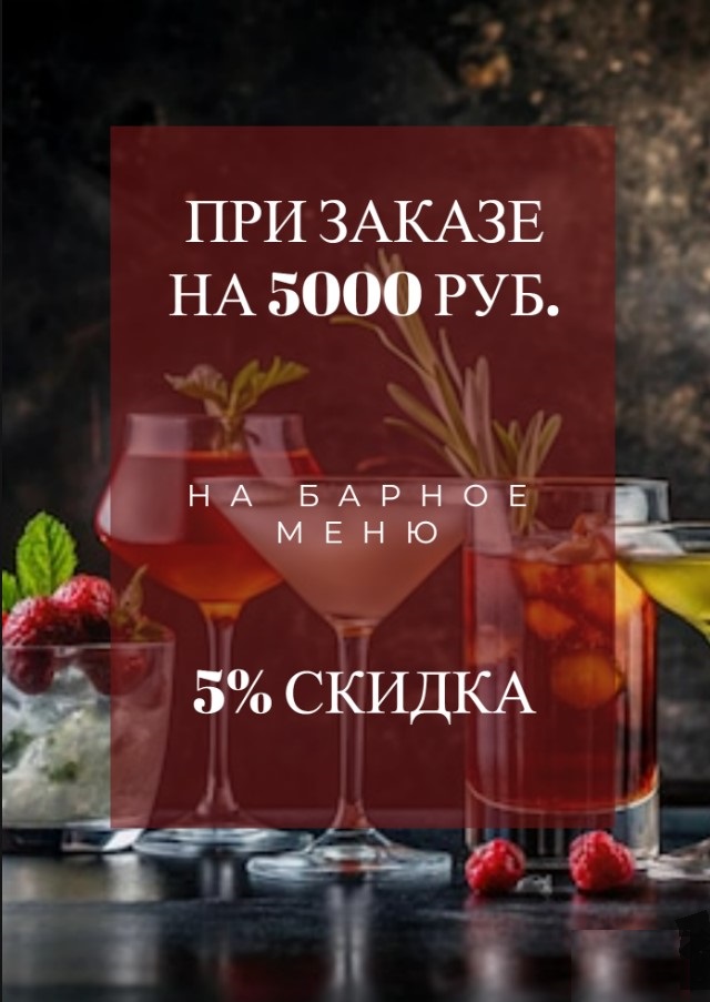 - СКИДКА 5% — на сумму в чеке от 5000 руб. (По бару).