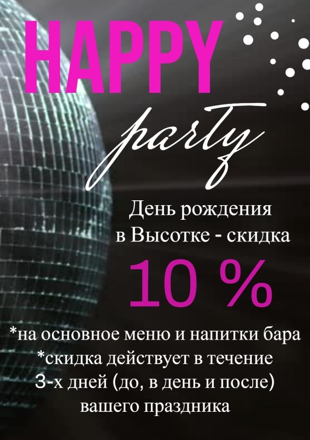 - СКИДКА 10% — на сумму в чеке в День Рождения! (По основному меню и напиткам бара).